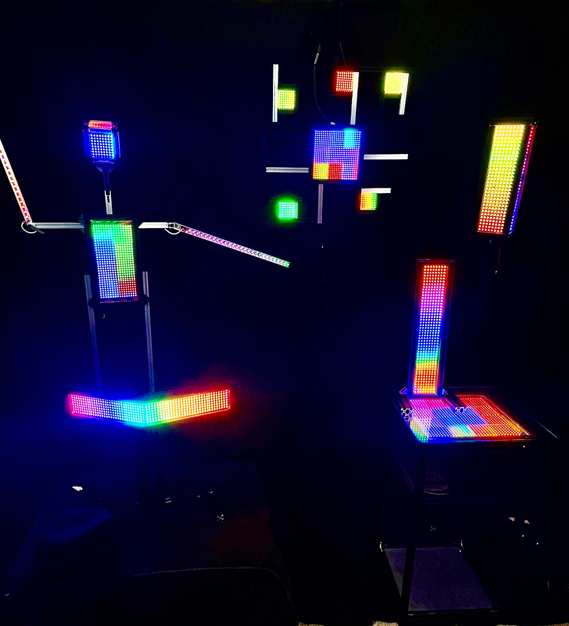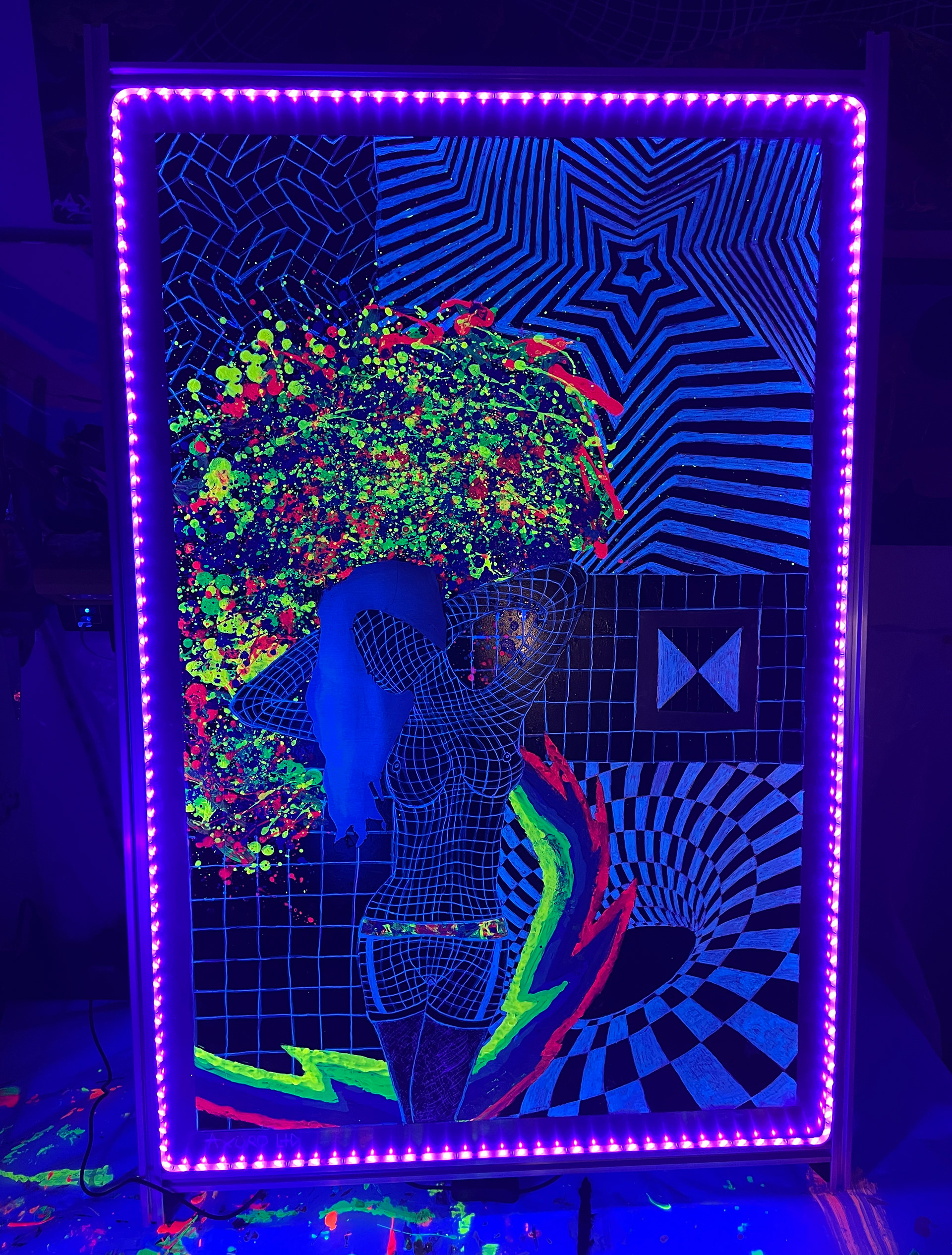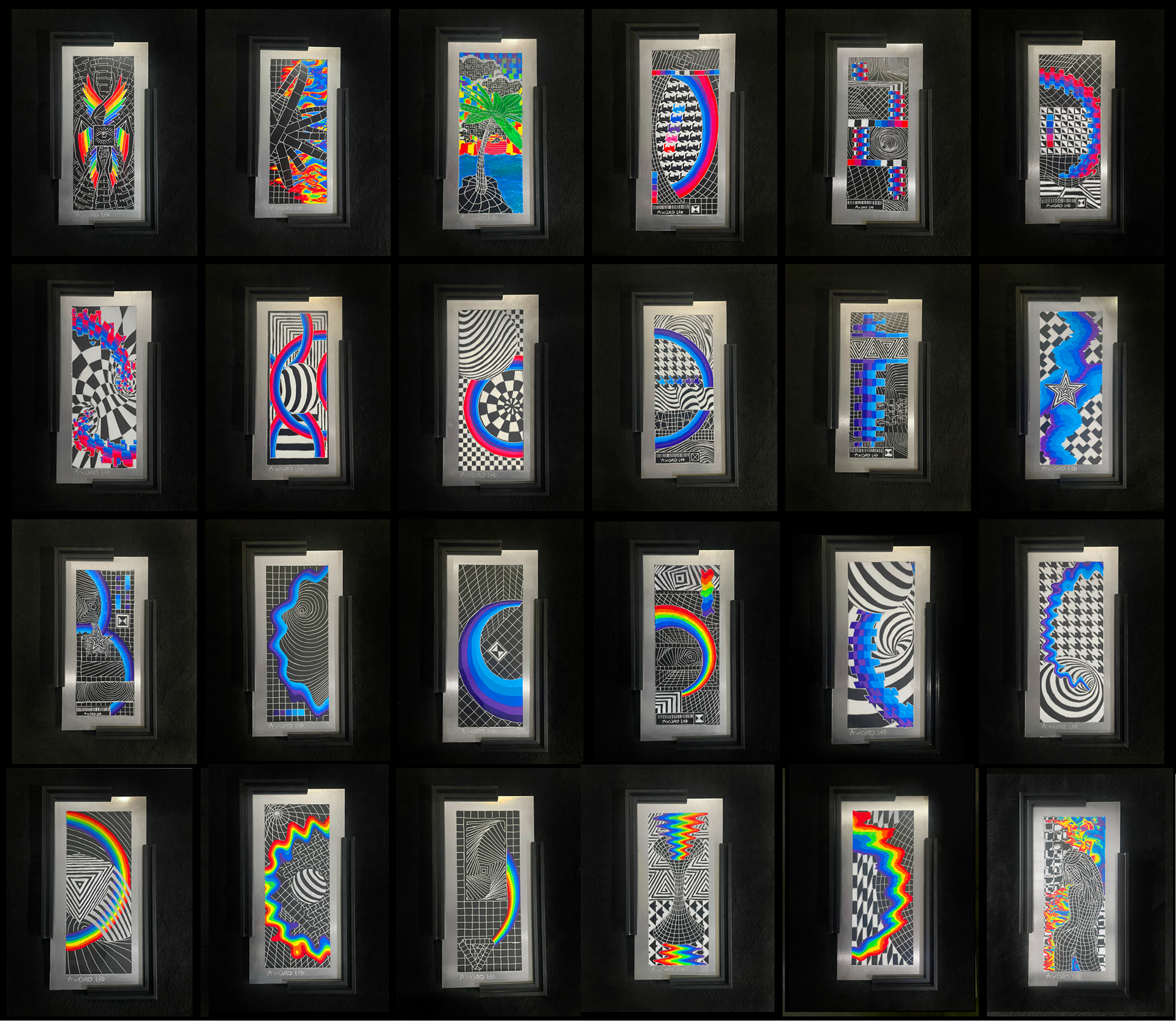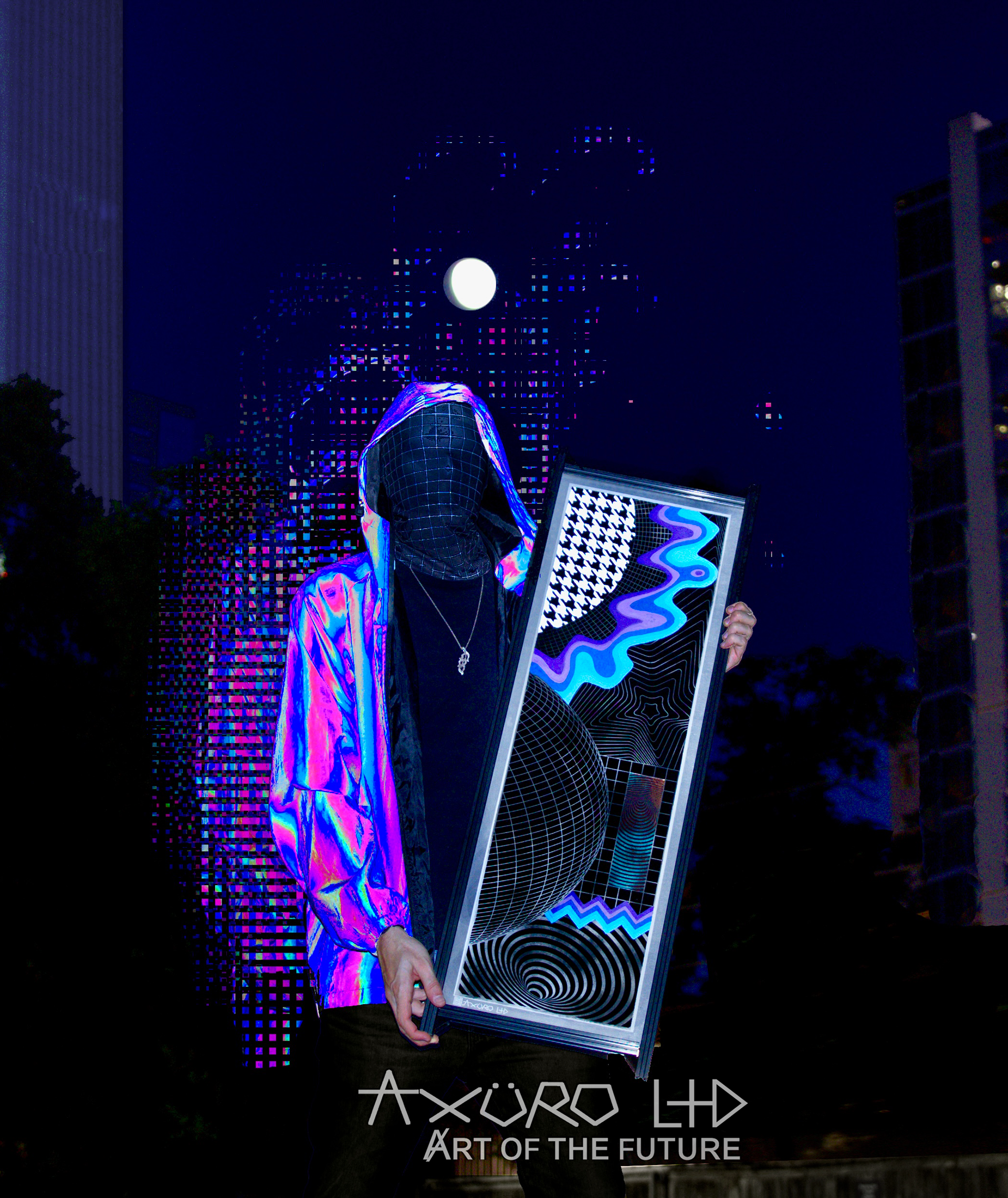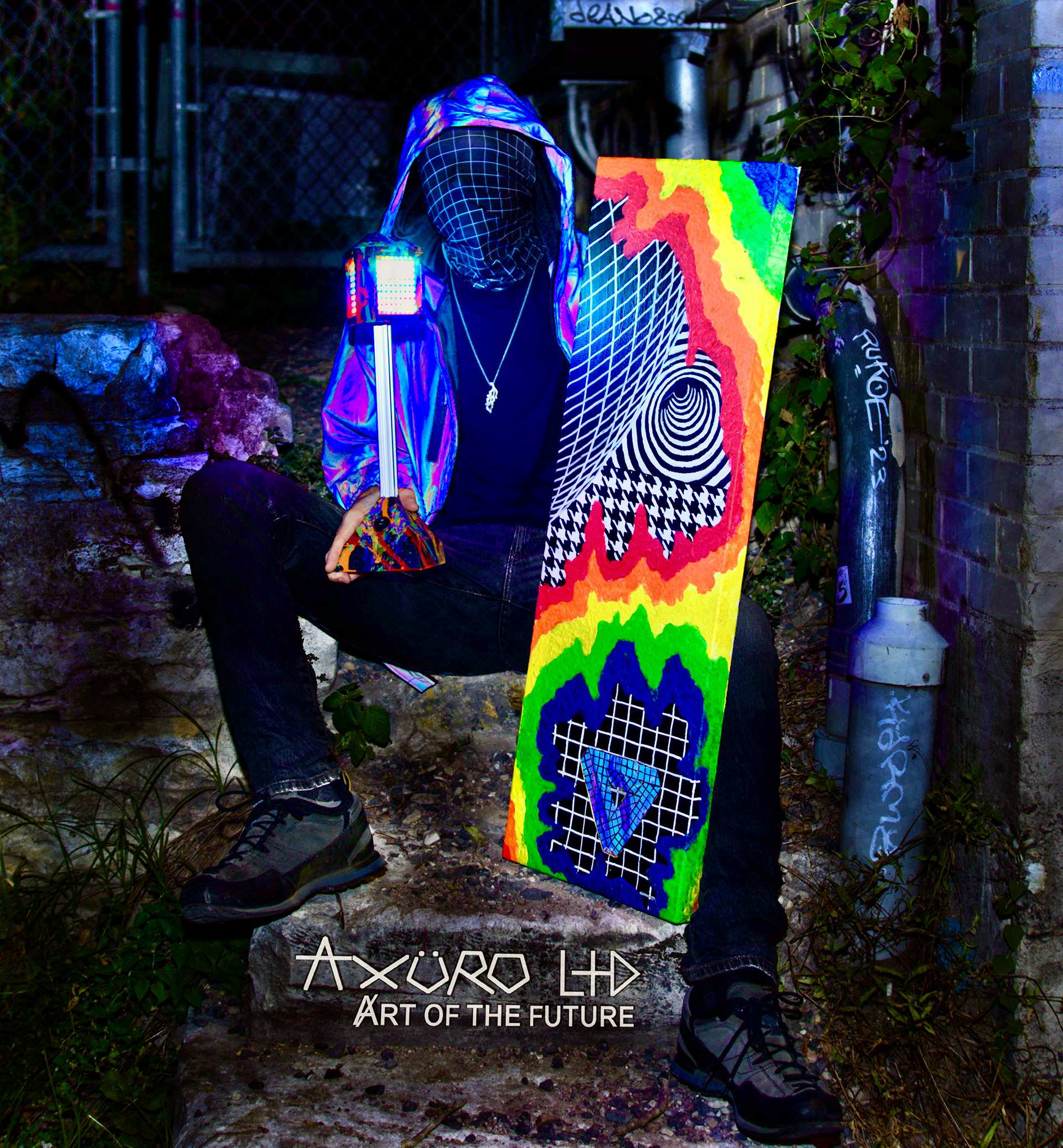 The aesthetics of Axuro LTD is defined by a fusion of optical illusions, color spectrums, and cymatic frequency distortions, often interwoven with wireframe figures and technological elements. Futuristic mediums like aluminum, electronics, and 3D printing have pushed his work into new territory, balancing precision with vibrant visual freedom.