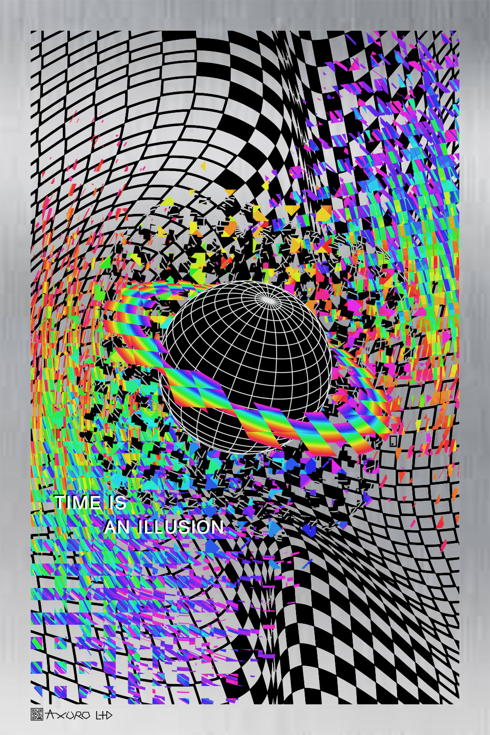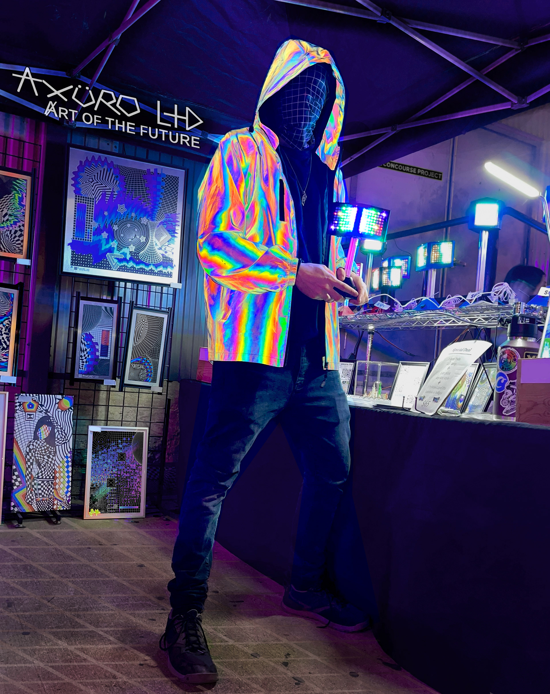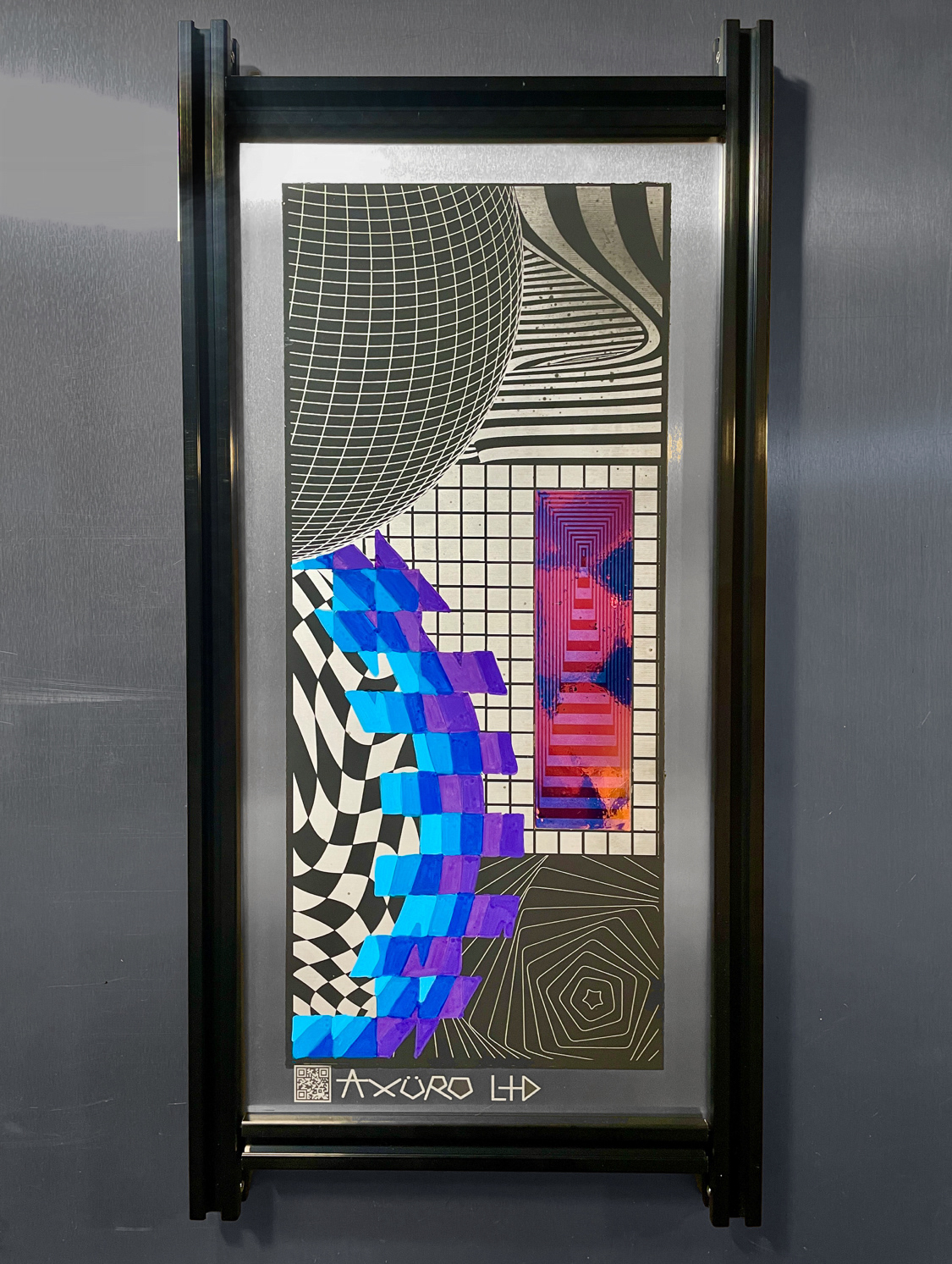 Axuro LTD is defined by a fusion of optical illusions, color spectrums, and cymatic frequency distortions, often interwoven with wireframe figures and technological elements. Futuristic mediums like aluminum panels, DIY electronics, and 3D printing have pushed his work into new territory, balancing precision with vibrant visual freedom. With the addition of Axuro Lighting Co & Tattoos, diversification has created the stability needed to commit to art full-time.