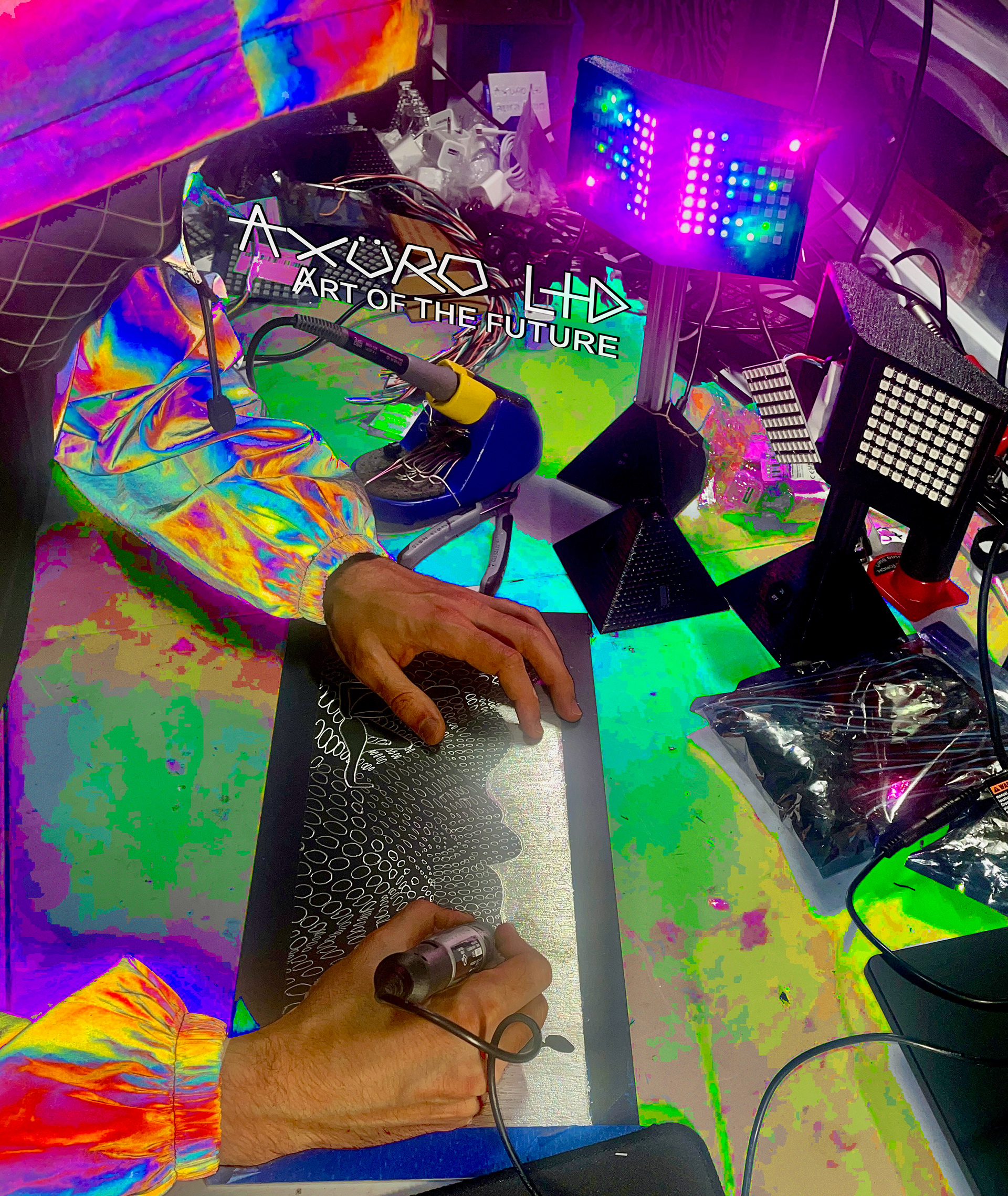 Axuro LTD is a collection of fine art by artist Waldo Harrison, founder of ALPACA. Having no formal training, his technique has been shaped over a decade of experimentation across countless mediums and techniques. From painting, engraving, and metalworking, to electronic tinkering, digital art, and 3D printing, his work explores the meeting point between art and technology.
