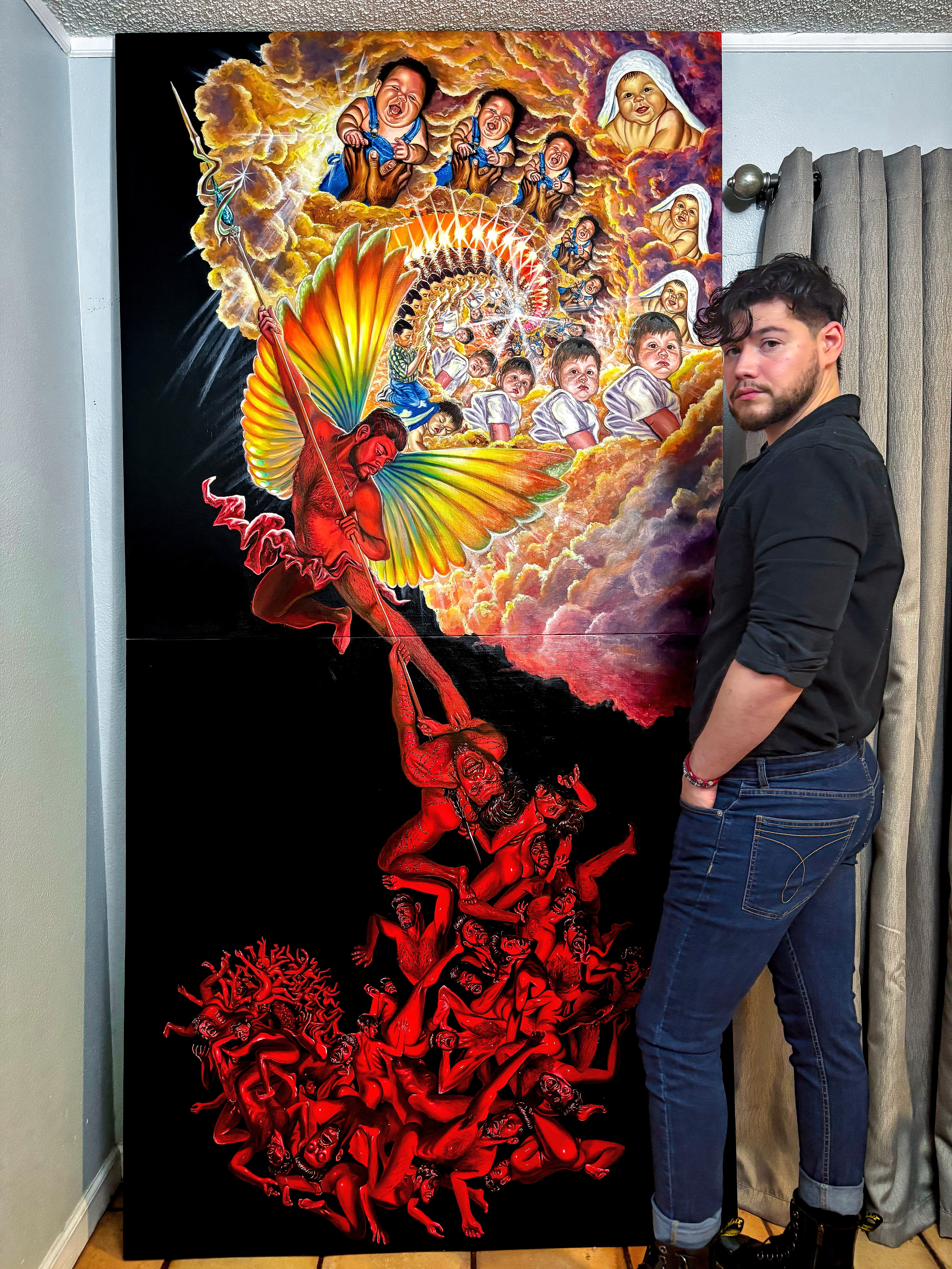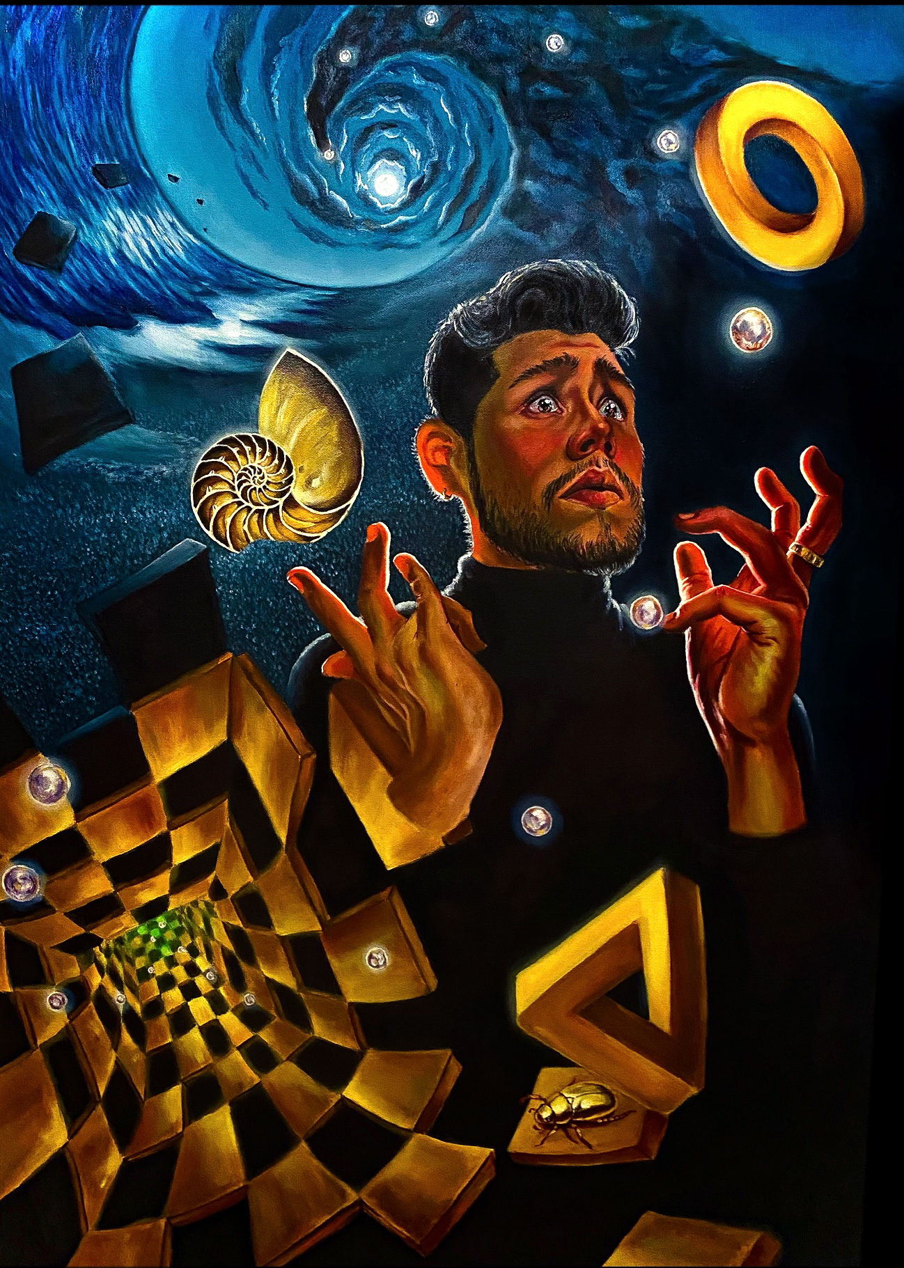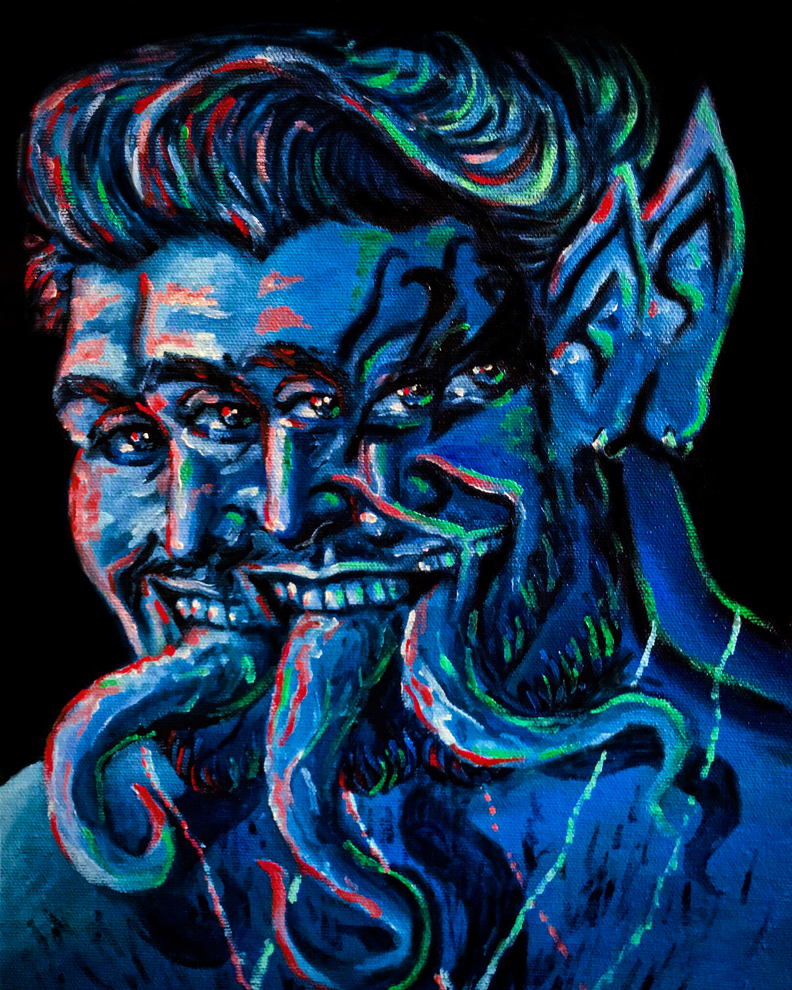 With my paintings, I like to evoke the feeling of being awestruck by an eye-catching comic book cover or film poster. I revere the surrealism of Frida Kahlo and Dalí, the brushstrokes of Van Gogh and Sergeant, and the intensity through the masterpieces by Caravaggio and Gabrielle Dell’Otto.