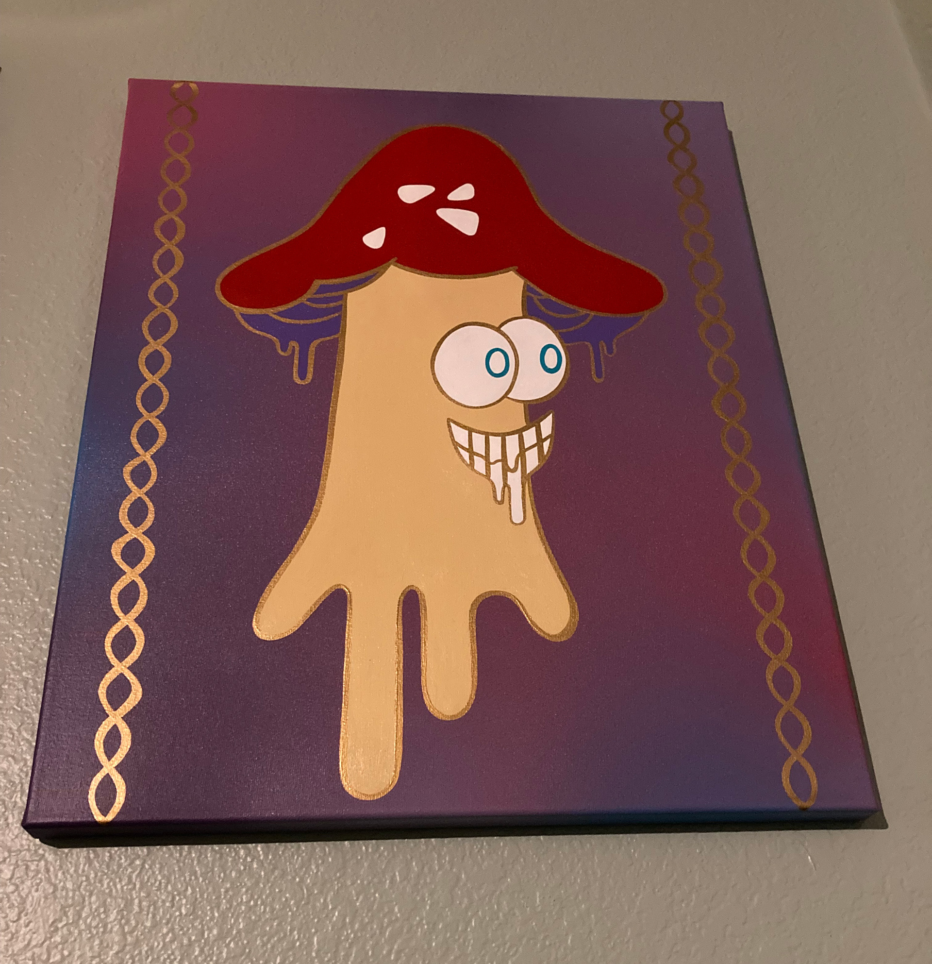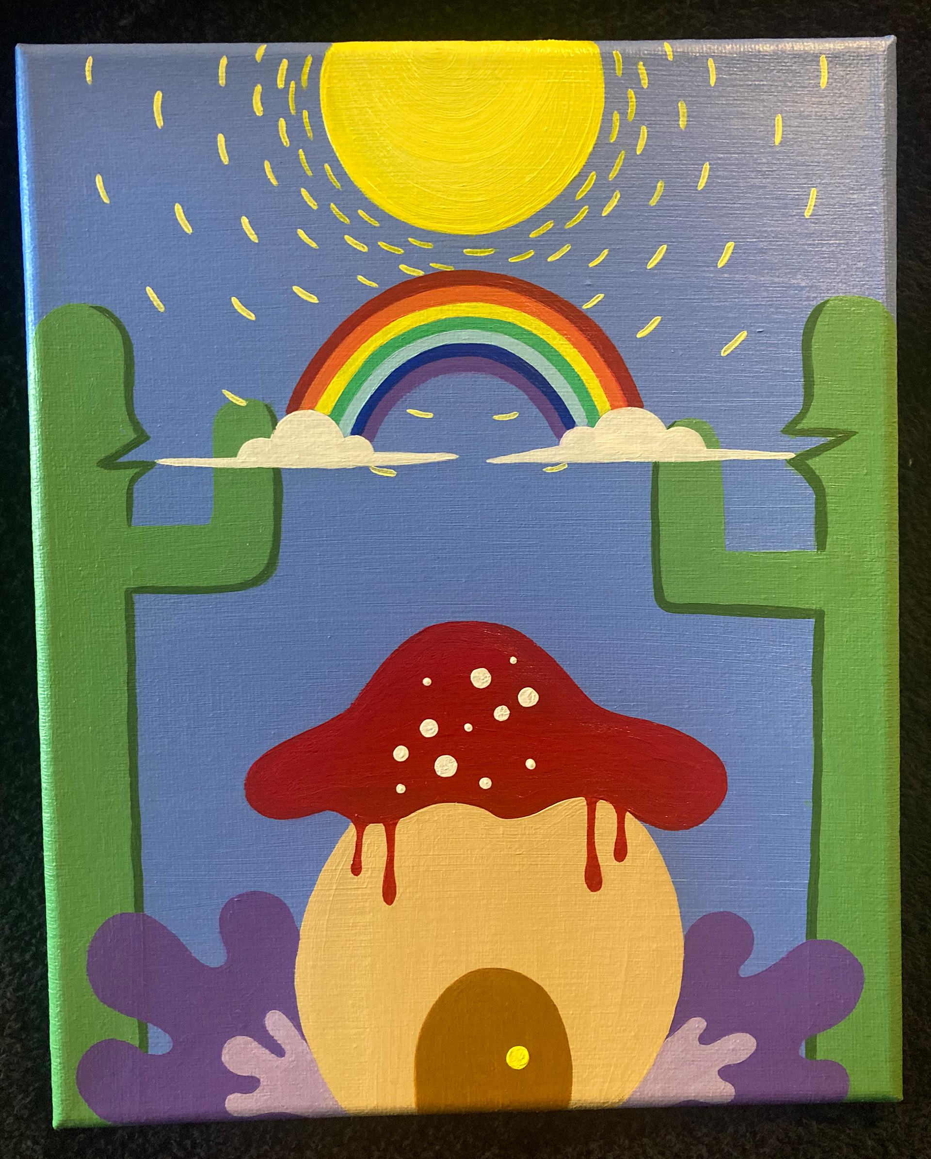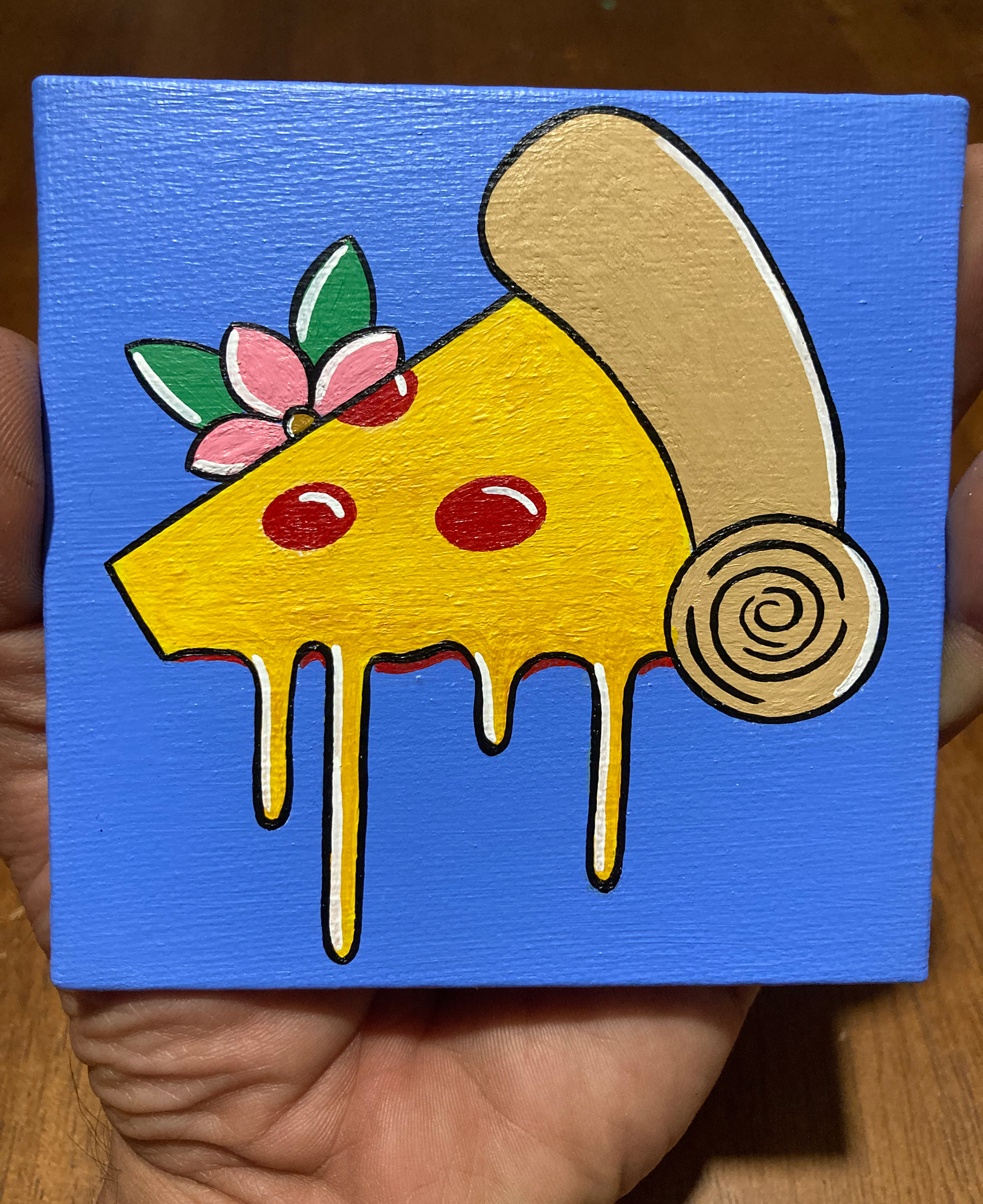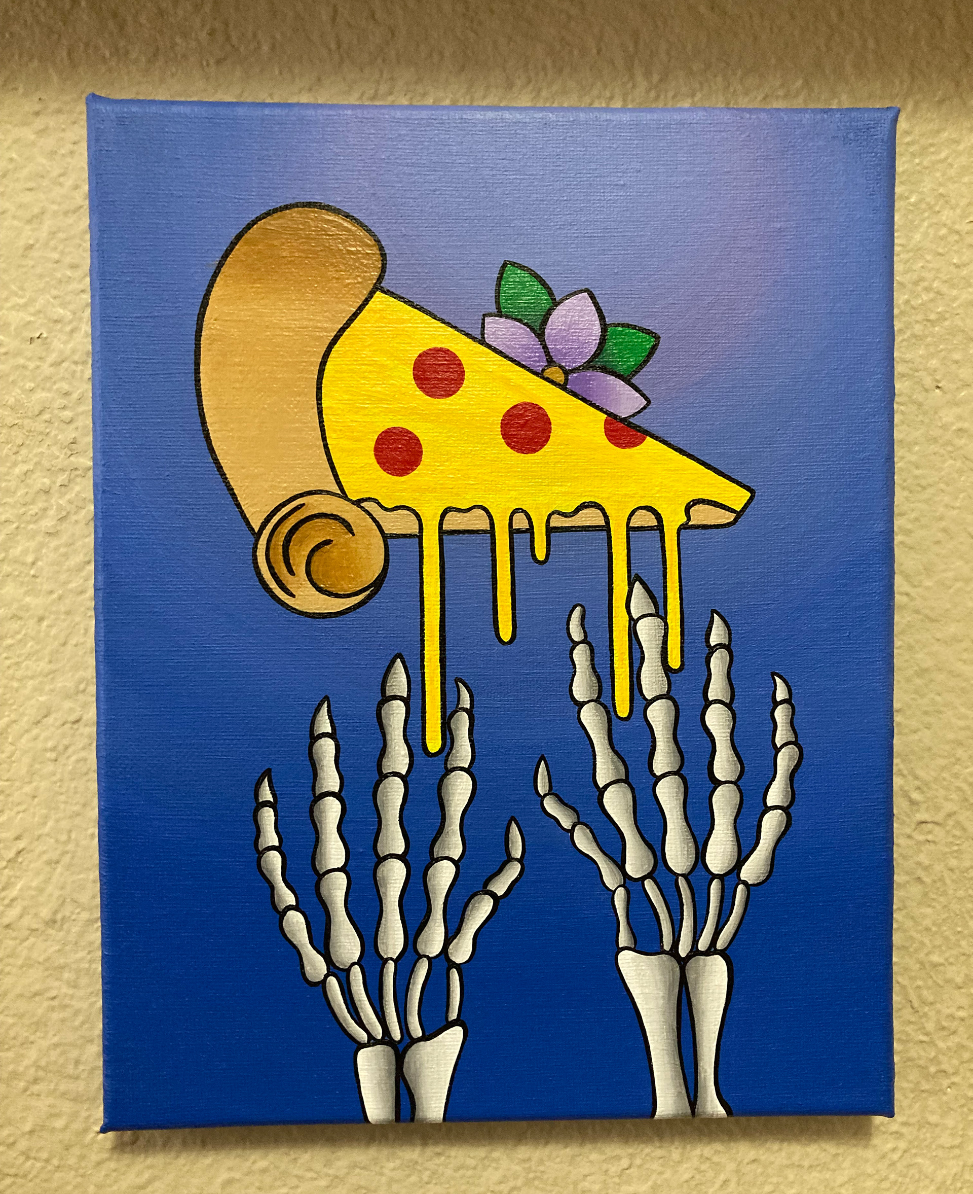 About the Artist: I am a painter who paints canvases and wooden panels with acrylic paint and brush. I also spray paint murals, paint signs for businesses, and custom paintings. My mediums of choice are acrylic paint, spray paint and enamel paint. I enjoy working with mixed media as well sometimes using spray paint, acrylic and enamel paint on the same painting. I am heavily inspired by nature with all its beautiful colors found within animals, plants, landscapes, sunsets, and sun rises. I often mimic the colors of the sky in my work which makes my painting bright with colors and perfect for making the artwork pop which is what I’m always after. I catch inspiration from everything. I can be eating a slice of pizza, having a beer with my slice and all of a sudden I know I have to paint a pizza slice kissing a glass of beer.